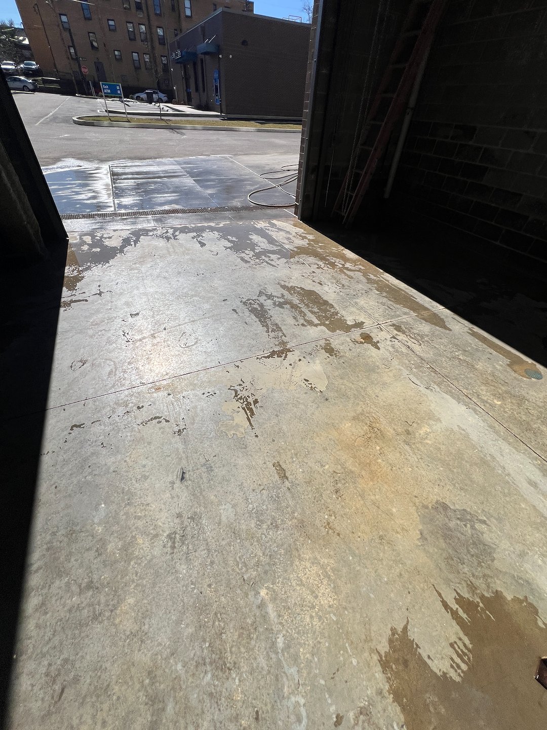 To get these results, we utilized our high-performance hot water pressure washing machines. Unlike cold water, our heated systems reach temperatures high enough to liquefy stubborn grease and break the bond between oil and concrete. Combined with a professional-grade, eco-friendly degreaser, we successfully stripped away layers of industrial grime that had been baked on by the sun. This dual-action process doesn't just make the concrete look better—it effectively sanitizes the area to keep your staff and customers safe.