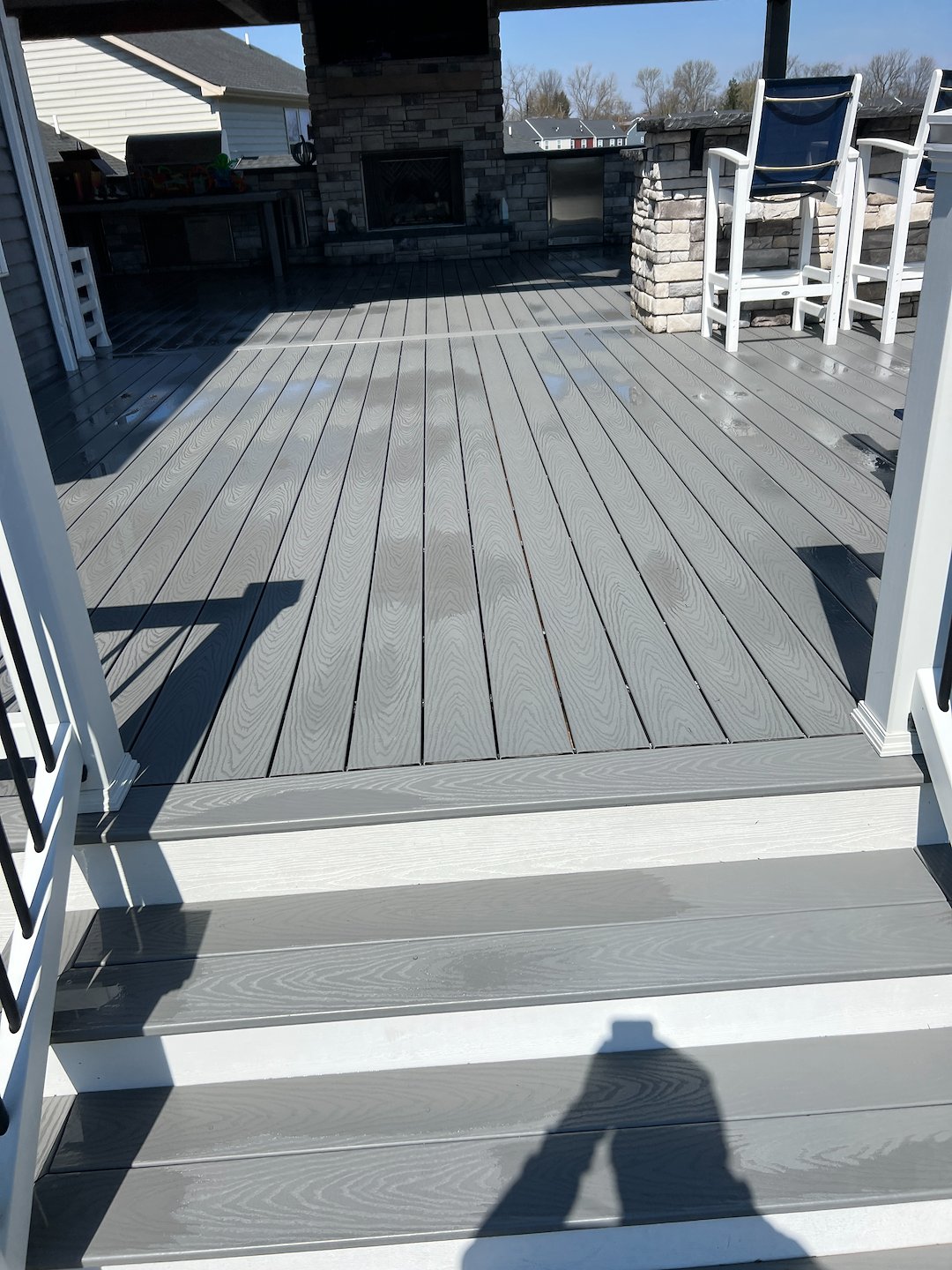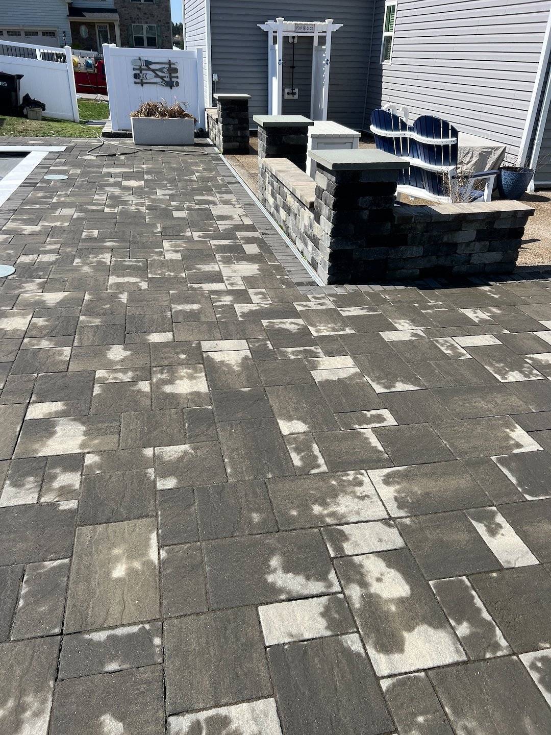 There is nothing better than a Pittsburgh summer by the pool, but the winter months can be tough on high-end hardscaping. We recently returned to a long-time client’s home in Ross Park to perform our signature annual deep clean. This project covers the entire outdoor entertainment hub—from the composite decking and covered outdoor kitchen to the expansive pool patio and stone retaining walls. By removing the buildup of organic growth and sediment every spring, we ensure the stone stays vibrant and the surfaces remain slip-resistant for the family.